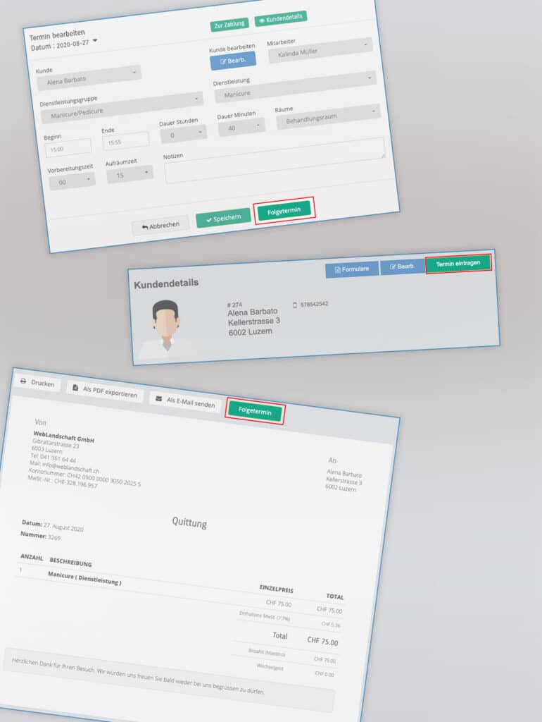 Sehr oft ist es der Fall dass Kunden nach dem Abschluss eines Termins bereits die nächsten Termine buchen möchten. Um dies zu beschleunigen wurde eine Folgetermin-Funktion in die Software integriert. Damit lässt sich an einigen Stellen der Software schnell ein neuer Termin für diesen Kunden in den Kalender eintragen.