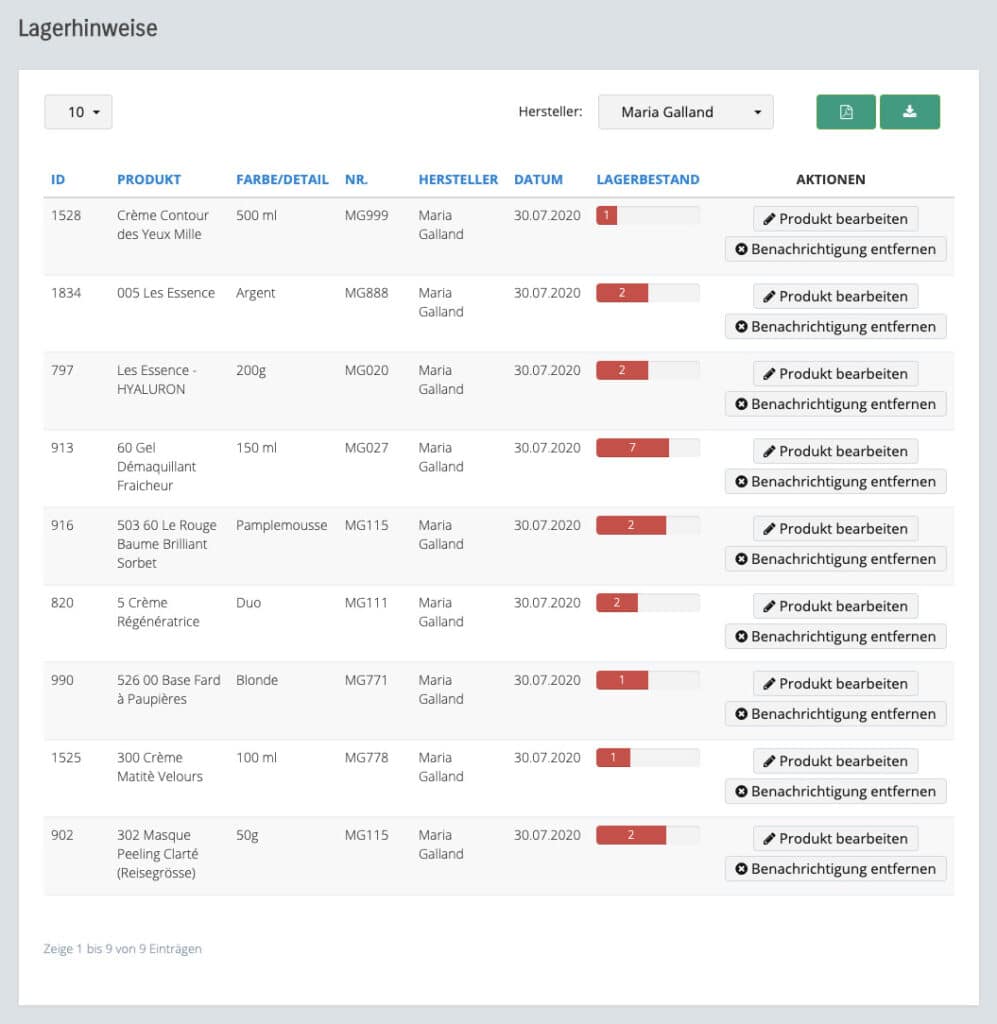 Die Einträge auf der Lagerbenachrichtigungs-Seite können neu als Excel exportiert werden damit die Liste noch aufbereitet werden kann.