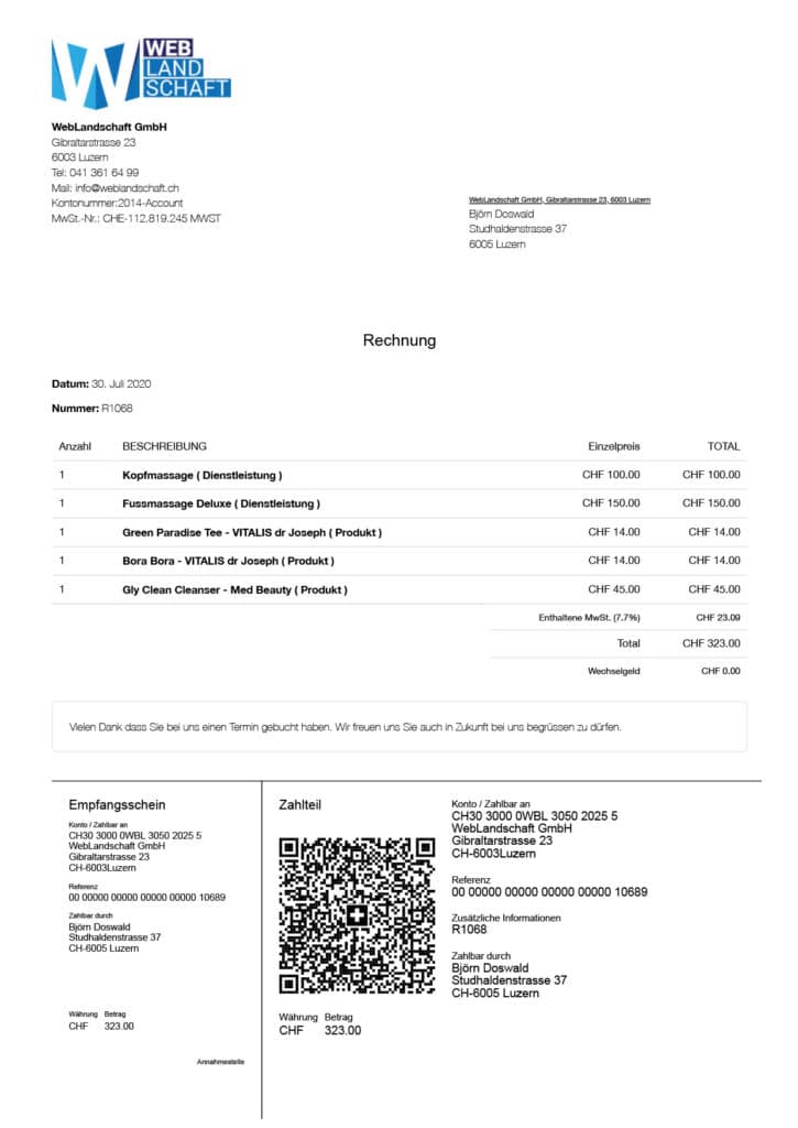 Seit dem 01. Juli gibt es in der Schweiz einen neuen Rechnungs-Standard welcher die bisherigen Einzahlungsscheine ablöst. Neu können auf Wunsch die Rechnungen inklusive dem offiziellen QR-Abschnitt erstellt werden damit der Kunde die Rechnungen einfach per scannen des Codes bezahlen kann.