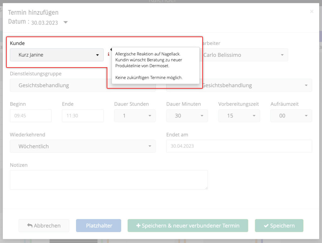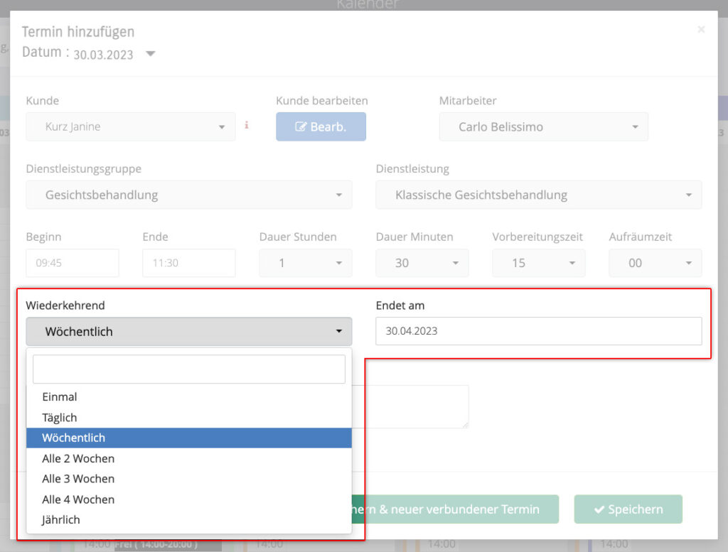 Kalender-Termine für Kunden können neu in wiederkehrender Form hinterlegt werden. Entweder Täglich, Wöchentlich, alle 2/3/4 Wochen oder Jährlich. Mit einem Enddatum wird definiert bis wann Einträge hinzugefügt werden sollen. Durch die Erfolgsmeldung kann geprüft werden ob das hinzufügen erfolgreich war oder an welchen Daten es aufgrund Termin-Konflikten nicht geklappt hat.
