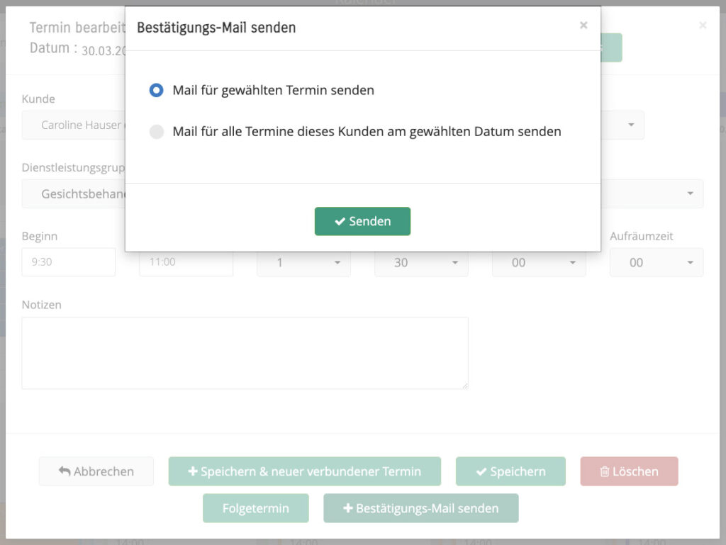 Beim klick auf einen Termin im Kalender kann mit dem «Bestätigungs-Mail senden» Button ein Mail an den Kunden verschickt werden. Neu kann nach dem klick auf den Button gewählt werden ob nur ein Mail für den aktuell angewählten Termin verschickt werden soll oder ein kombiniertes Mail für alle Termine dieses Kunden am selben Datum.