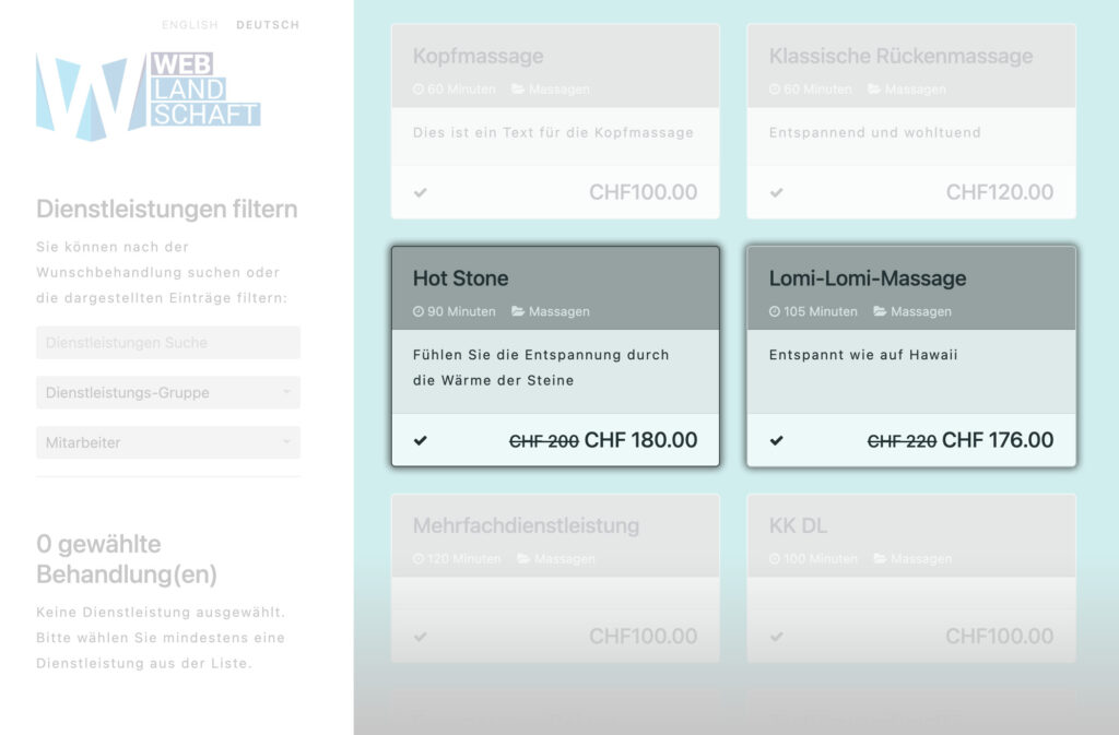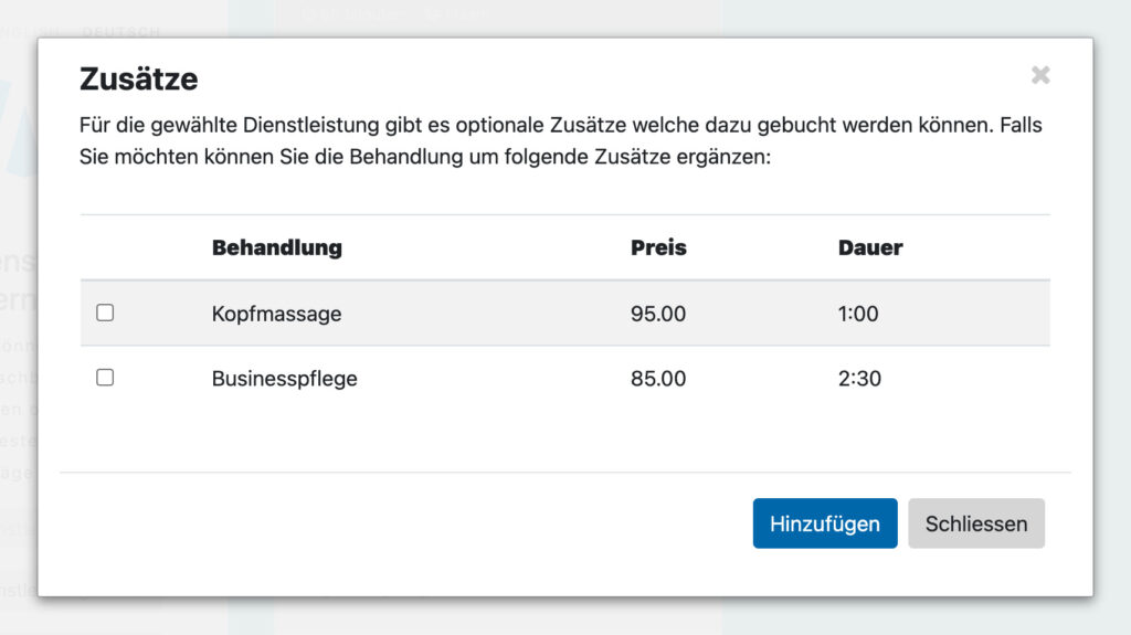 Beim buchen können dem Kunden neu weitere Behandlungen vorgeschlagen werden welche gut zur gewählten Leistung passen würden. Der Kunde kann entscheiden ob er diese ebenfalls buchen möchte oder nicht. Um dies zu hinterlegen können bestehenden Dienstleistungen auf der Seite «Dienstleistungen/Preise» bearbeitet und eine oder mehrere Leistungen als Zusätze im Auswahlfeld gewählt werden.
