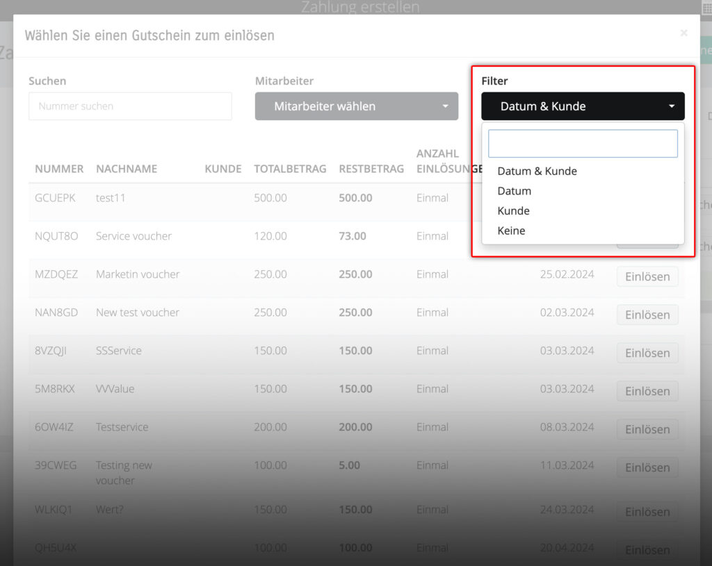 Beim einlösen von Gutscheinen innerhalb einer Zahlung wird automatisch nach einlösbaren gefiltert. Wichtig ist ob der beim Gutschein hinterlegte Kunde identisch ist mit dem Kunden in der Zahlung oder ob der Gutschein abgelaufen ist. Neu kann selbständig gewählt werden welche Filter angewendet werden sollen. Der Datums-Filter kann entfernt werden um auch abgelaufene Gutscheine darzustellen und einzulösen. Beim entfernen des Kunden-Filters stehen Gutscheine anderer Kunden zur Verfügung.