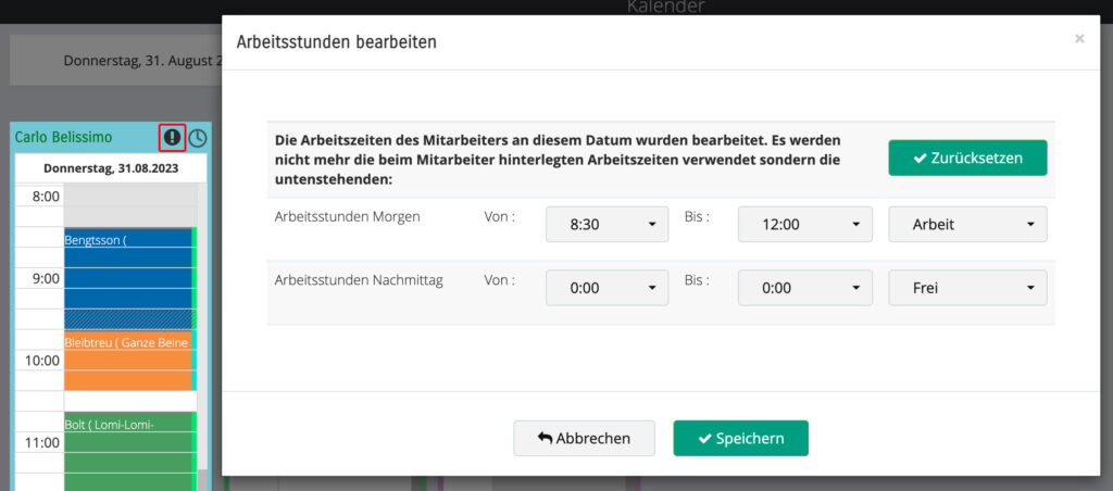 Auf der Kalenderseite können per Klick auf die Spalte einzelne Arbeitstage/Stunden von Mitarbeitern bearbeitet werden und damit überschrieben werden. Bei allen bearbeiteten Tagen wird neu ein Ausrufezeichen-Icon dargestellt welches darauf hinweist dass dieser Tag überschrieben wurde. Per klick auf das Icon können die bearbeiteten Zeiten erneut angepasst werden oder es steht auch eine Funktion zur Verfügung um den Tag auf die originalen Arbeitszeiten zurückzusetzen.
