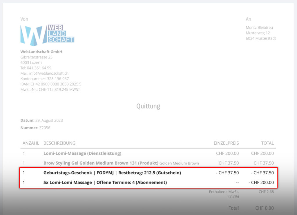 Wenn Details eines Gutscheins oder eines Abonnements via «Zahlungsdetails» Button angesehen werden, werden im Pop-Up übersichtlichere und praktischere Daten dargestellt. Restwerte oder die Anzahl Resteinlösungen sind in praktischer Verlaufsdarstellung sichtbarer.