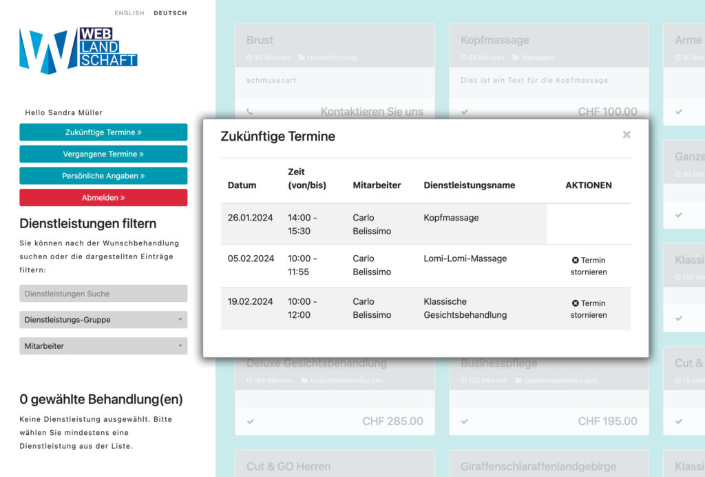 Zusätzlich steht eine Ansicht aller zukünftiger Termine zur Verfügung. Für diese Ansicht kann eingestellt werden ob der Kunde selbständig einen gebuchten Termin stornieren kann. Ausserdem kann definiert werden wieviele Tage im voraus eine Stornierung des Termins möglich sein soll.