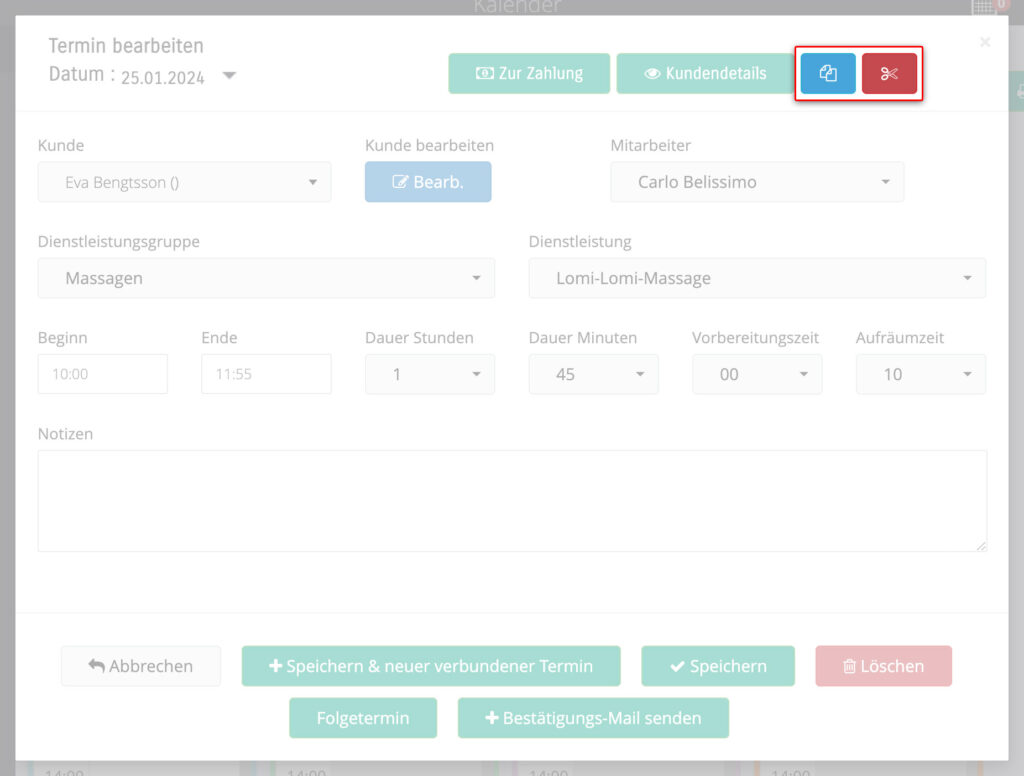 Wenn im Kalender ein bestehender Termin geöffnet wird steht neu die Funktion zur Verfügung diesen zu kopieren oder auszuschneiden und an einem anderen Datum & Zeit wieder einzufügen. Sollte der Kunde mehrere Termine am selben Datum haben wird die Option dargestellt alle Termine kombiniert an eine andere Stelle zu verschieben/kopieren.