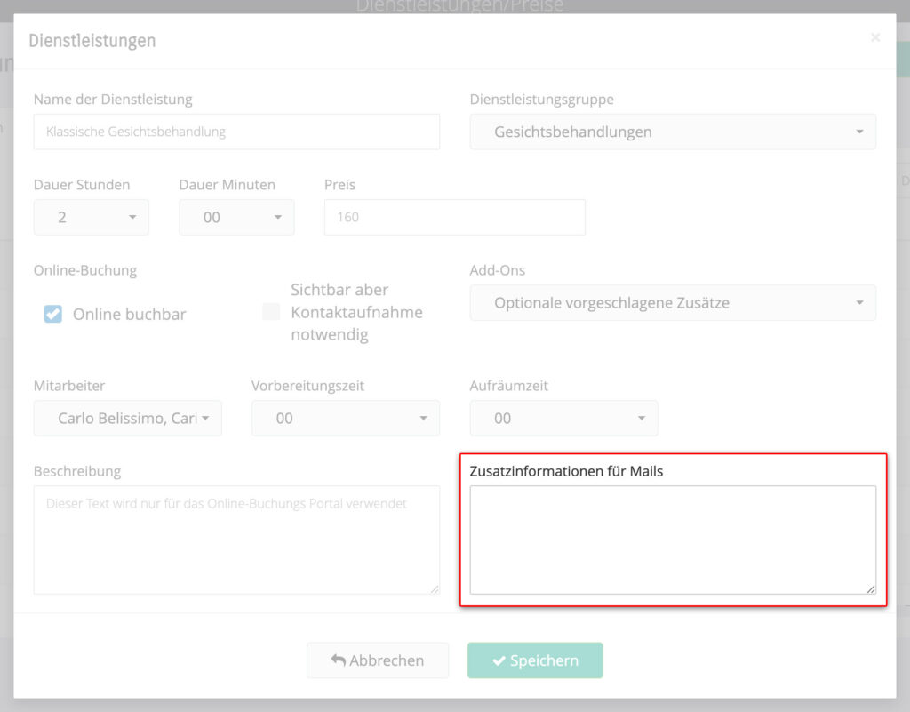 Bei Dienstleistungen steht ein neues Textfeld zur Verfügung. Die hinterlegten Texte lassen sich mit einem neuen Platzhalter in Erinnerungs- oder Bestätigungs-Mails integrieren. Sollten bei gewissen Behandlungen wichtige Infos zu beachten sein können diese Angaben damit in die Mails integriert und automatisch in den bestehenden Mails verschickt werden.