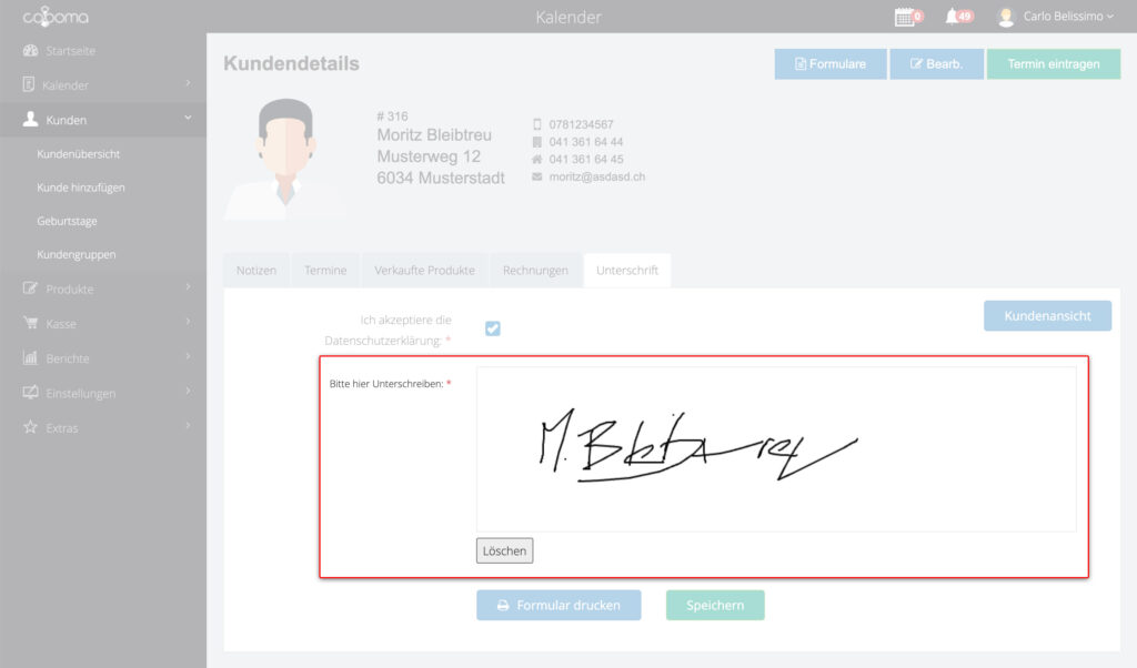 Es steht ein neues Feld für Kundenformulare zur Verfügung. Das Feld «Unterschriften» kann hinzugefügt werden damit der Kunde mit der Maus oder auf einem Touchscreen eine Unterschrift hinterlegen und so ein Formular signieren kann. Das Bild der Unterschrift wird zum Formular gespeichert.