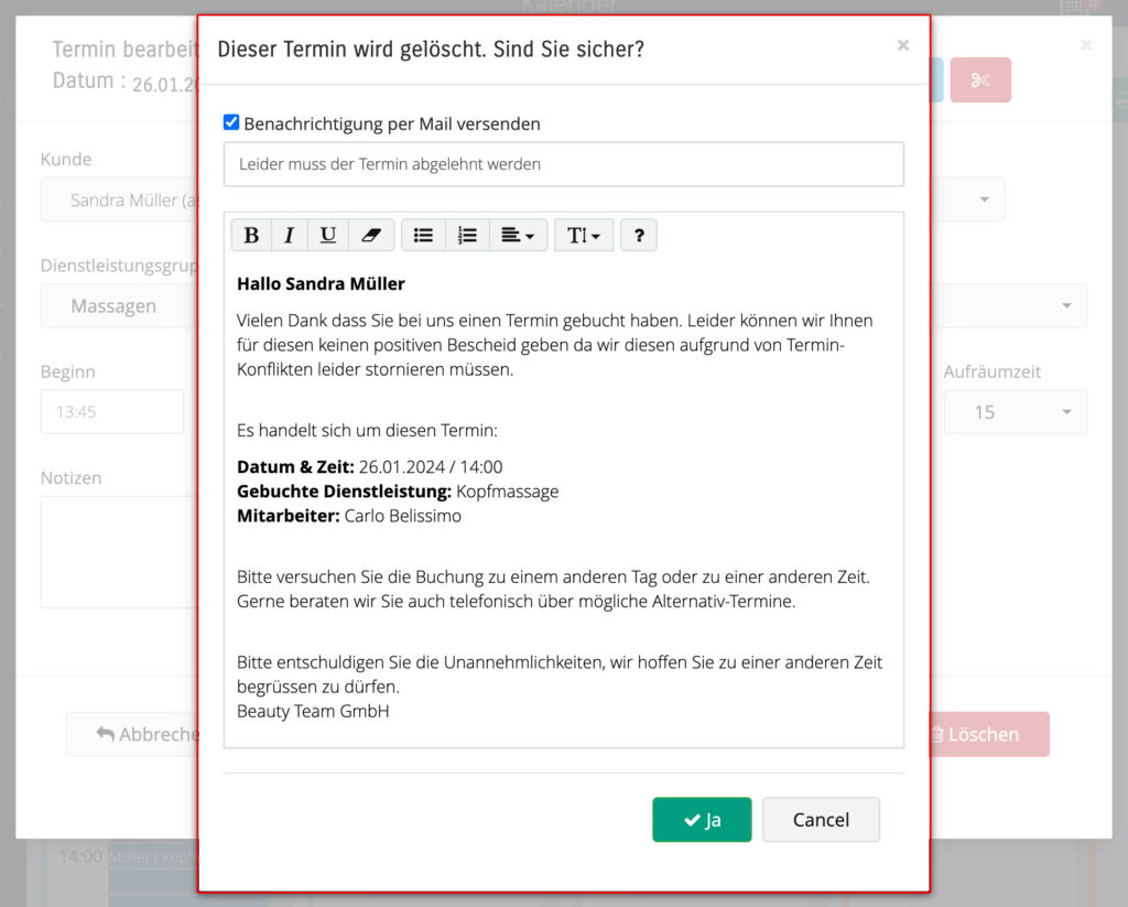 Wird ein Termin aus dem Kalender gelöscht kann neu direkt ein Mail verschickt werden. Bei Aktivierung der Benachrichtigung wird das bereits hinterlegte Absage-Mail in eine Mailvorlage umgewandelt und in einem Editor dargestellt. Das Mail kann noch beliebig angepasst und anschliessend an den Kunden verschickt werden.
