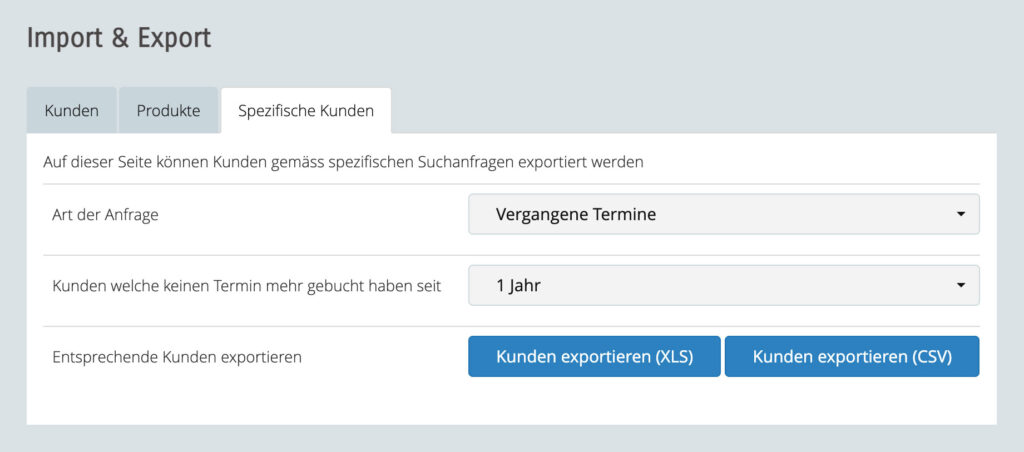 Auf der Seite «Import/Export» können im Tab «Spezifische Kunden» Kundendaten exportiert werden. Neu steht dort die Abfrage «Vergangene Termine» zur Verfügung um Kunden zu finden welche seit 6 Monaten, 1 Jahr oder 2 Jahren keinen Termin mehr gebucht haben. Die Kundendaten lassen sich als Excel oder CSV exportieren.