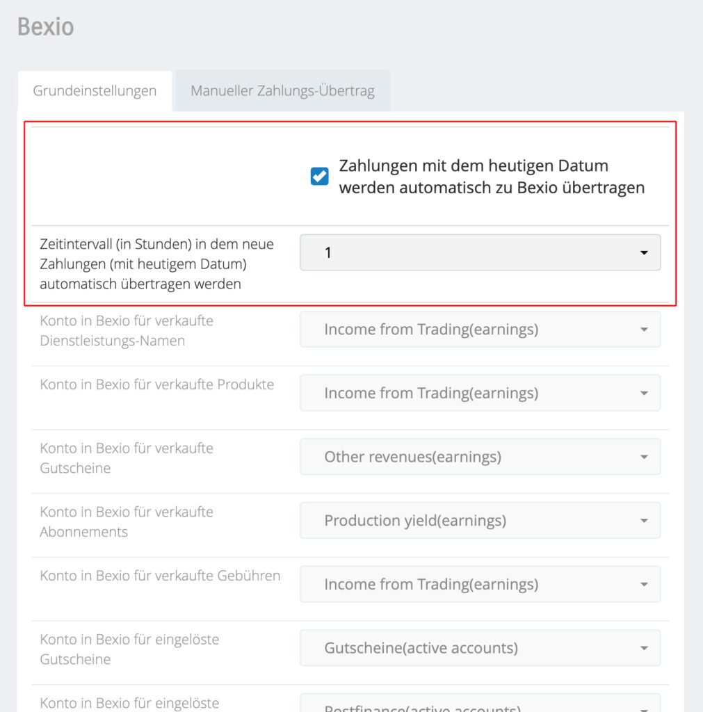 Sobald die Verknüpfung ausgeführt wurde stehen unter dem Menüpunkt Bexio weitere Einstellungsmöglichkeiten für die Schnittstelle zur Verfügung.
