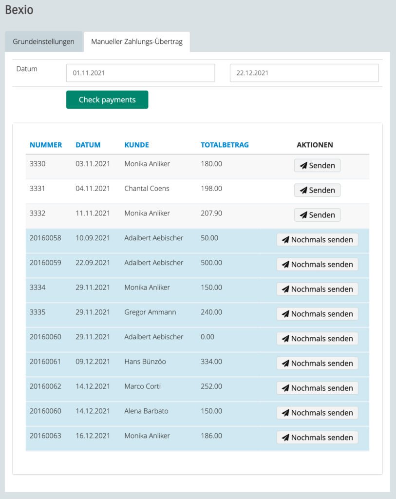 Auf der Seite Bexio befindet sich der Tab Manueller Zahlungs-Übertrag. In diesem lässt sich ein Datums-Zeitraum auswählen welches anschliessend sämtliche erstellten Zahlungen an den gewählten Daten darstellt. Per klick auf den Button Senden kann die gewählte Zahlung direkt nach Bexio übertragen werden.
